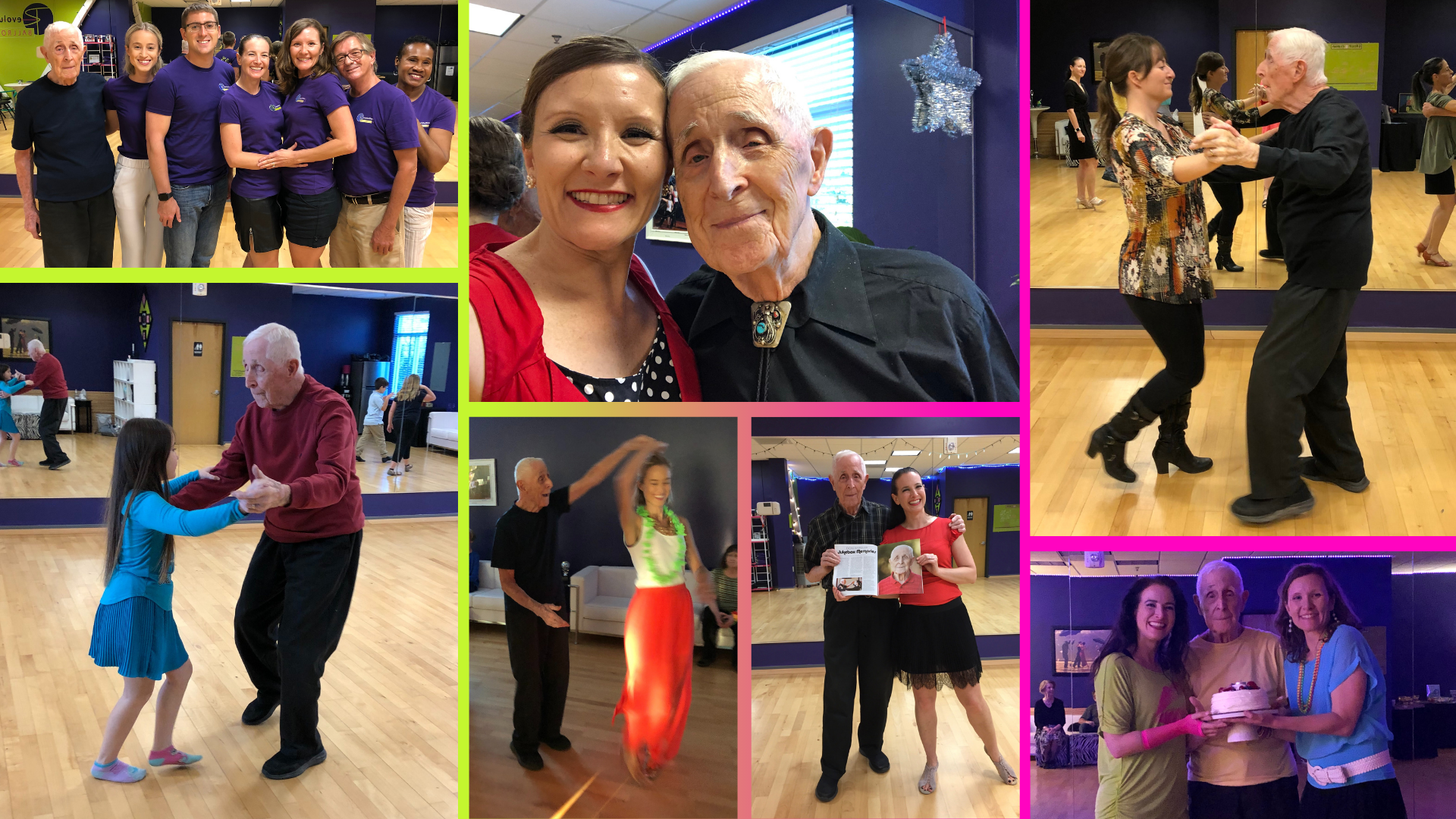 And he’s always working to improve. After each class he’ll ask me, “how’d I do coach?”. He inquires what he needs to do to take his dancing to the next level. He’ll ask me to clarify moves that kept him up half the night trying to remember them. Don also enjoys the spotlight. For his birthday, we celebrate at our party with a cake and a birthday dance, a Waltz during which we invite all the ladies to line up and enjoy a dance with him. This pleases Don immensely. At his 93rd birthday, he asked me, “How’d I do?”, and I told him he did just fine. And he told me – he didn’t want to do fine – he wanted to put on a show!